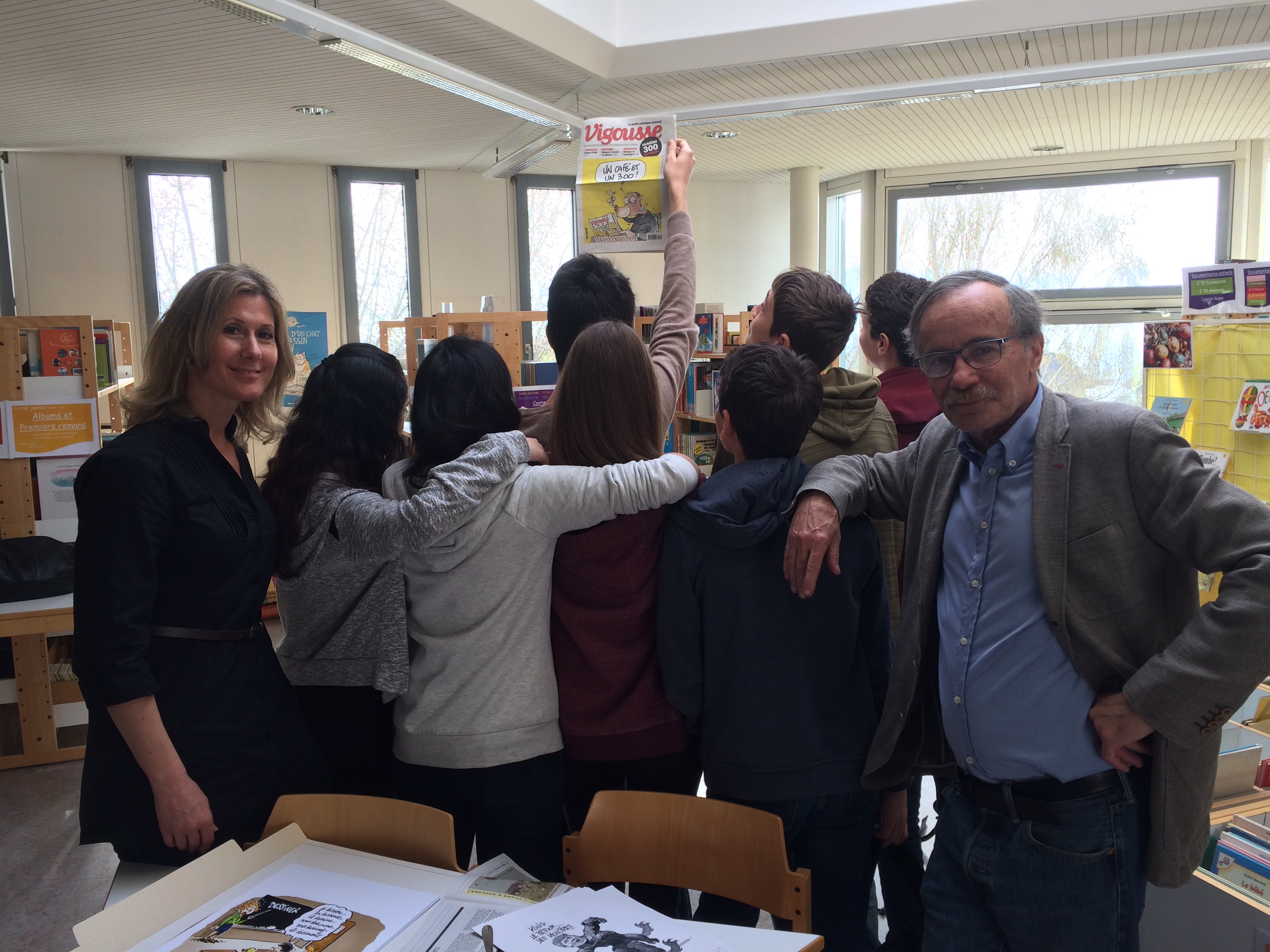 Le vendredi 31 mars, dans le cadre de la 14e semaine des médias à l’école, la 9VP/1 et la 10VG/2 ont eu la chance de rencontrer Barrigue, fondateur de la revue satirique romande Vigousse, et Caroline Rutz, dessinatrice de presse qui publie dans ce journal depuis ses débuts (les débuts du journal et ceux de la dessinatrice!) à la bibliothèque scolaire.